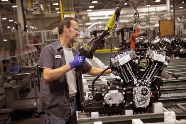 在美国威斯康星州的一家哈雷-戴维森摩托车工厂内,工人正在组装发动机。(美国消费者新闻与商业频道网站)