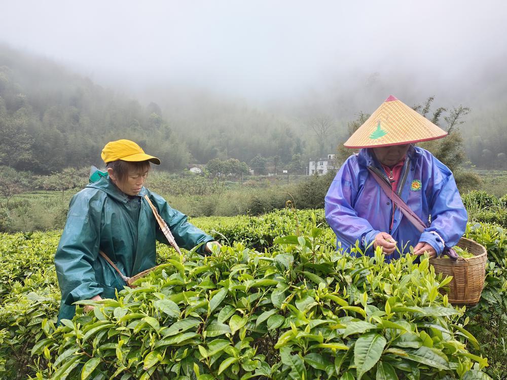 走进位于马市镇猪洞迳十钱生态有机茶场,放眼望去,只见云雾缭绕的茶山春意盎然,一垄接一垄。几十名工人身穿雨衣、头戴斗笠,手指在茶树上翻飞,熟练地采摘着半寸长短的新叶。在她们满载的茶筐里,翠嫩饱满的芽头密匝层叠,散发出沁人的清香。
