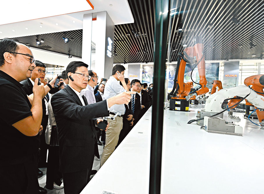 李家超聽取庫卡機器人(廣東)有限公司代表講解機械臂的操作。香港特區行政長官李家超昨日下午轉往佛山與特區政府及立法會大灣區訪問團「紫組」匯合,參觀機器人公司等。李家超說,佛山有完善的產業鏈,香港科研成果卓越,可轉化落地生產,進行上游生產後,與粵港澳大灣區其他城市進行合作,而香港在吸納國際人才方面亦有優勢。他強調,這是大灣區發展的精髓,每個城市都有優勢,大家優勢互補,合作共贏,既跑得快,也跑得遠。有訪問團成員在參觀後表示,香港應研究引入機械人,應對人手短缺等問題。