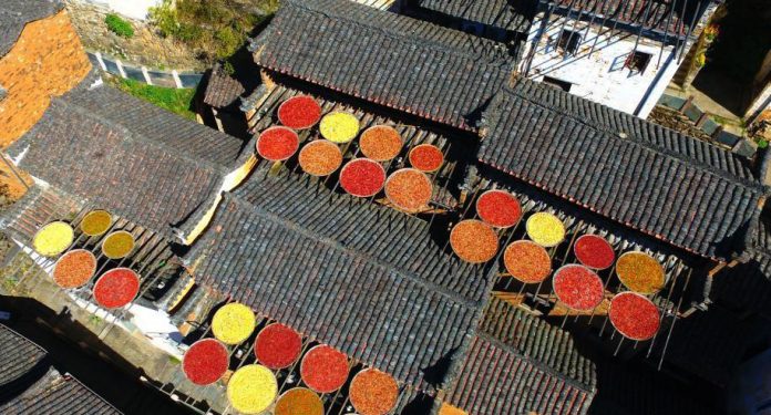 美好生活 “晒秋”——六百年历史古村独特一景观 By guojiribao - 2018 年 10 月 29 日 0 145 篁岭村位于江西省上饶市婺源县东北部,是著名的“晒秋”文化起源地,也是一座距今近六百历史的徽州古村。每当日出山头,数百栋徽派古民居在百米落差的坡面错落排布,整个山间村落徽式民居土砖外墙与晒架上五彩缤纷丰收成果组合,绘就出“晒秋”农俗特色景观。 金秋十月,众多来自海内外的游客慕名前来感受“晒秋”农俗特色景观,欣赏婺源乡村美景。