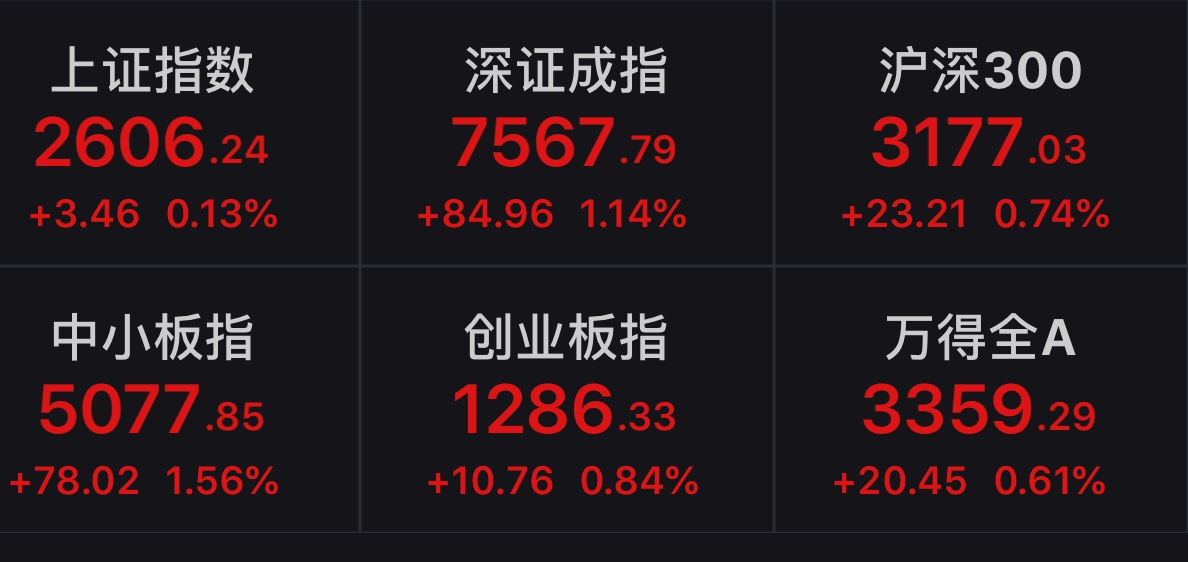 截至收盘,沪指收报2606.24点,涨0.13%,成交额1803亿。深成指收报7567.79点,涨1.14%,成交额2030亿。创业板指收报1286.33点,涨0.84%,成交额618亿。