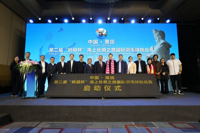 10月15日,2018“妈祖杯”海上丝绸之路国际羽毛球挑战赛在北京万豪酒店启动。记者从启动现场获悉,赛事将于11月22日至25日在福建莆田市体育中心举行,由福建省体育局、莆田市人民政府主办,福建省羽毛球协会、莆田市体育局、莆田市湄洲日报社、莆田市兴发集团有限公司协办。莆田市副市长陈志强、中国前驻菲律宾宿务总领事佘春树、中国报业协会品牌推广部主任徐文君、莆田市湄洲日报社社长许晨聪、莆田市兴发集团董事长林伟新、莆田市体育局副局长柯向东、莆田市政府驻北京联络处主任彭雄飞、北京莆田商会会长黄文盛、莆田市兴发集团副总经理邹水高、北京垄聚体育有限公司代表李根、奥运冠军张宁出席了发布会。
