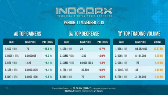 近日,GSC在印尼最大交易所Indodax市场表现出色,成为印尼市场的热门项目。根据11月11日indodax发布的交易所日报,GSC成为当日该交易所涨幅冠军,交易量也超越以太坊,成为继BTC、BCH之后的第三大热门数字货币。而在此之前,GSC已经连续一周时间在indodax的热门榜单中榜上有名。