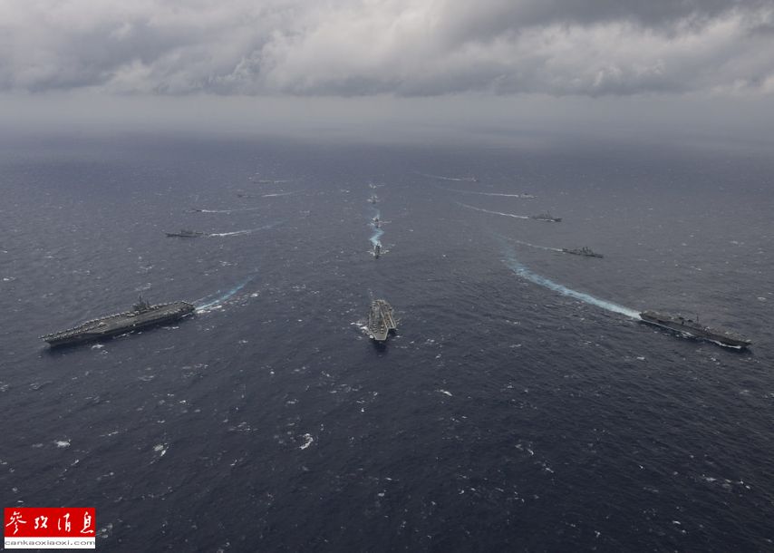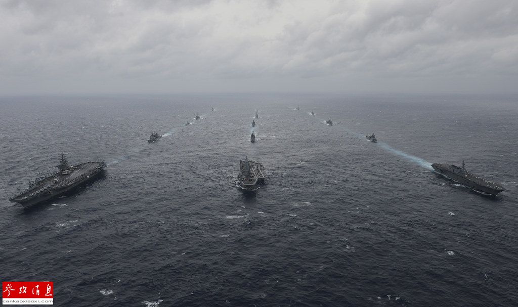 另据《印度时报》7月11日报道称,一名不愿透露姓名的美军官员表示,此次军演将对中国产生显著影响(主要针对中国),“他们将知道我们(美日印三国)海军是团结在一起的,可以抵御各种威胁。”图为参加“马拉巴尔”军事演习的3艘航母,由近及远分别是美国海军“尼米兹”号核动力航空母舰,印度海军“超日王”号航空母舰和日本海上自卫队“出云”号直升机航空母舰。