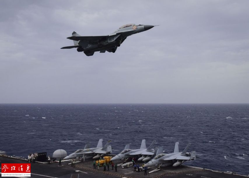 卡内基印度中心外交政策专家沙维尔表示,通过此次军演,美国旨在向印度传达双方共同塑造亚洲安全环境的承诺。图为1架印度海军米格-29K战斗机低空飞越”尼米兹“号航母飞行甲板。