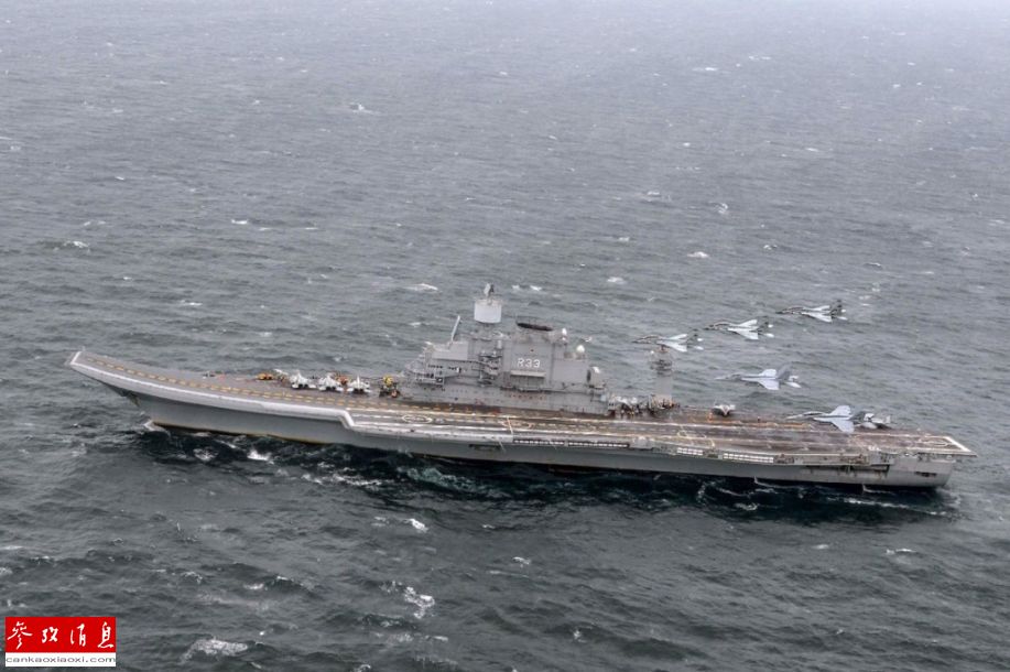 今年的“马拉巴尔”海上联合军事演习的内容涵盖在孟加拉湾进行的潜艇识别训练、舰队防空及对地攻击训练、海上搜索训练和反潜训练。图为参演演习的舰载机群飞越印度海军“超日王“号航空母舰。