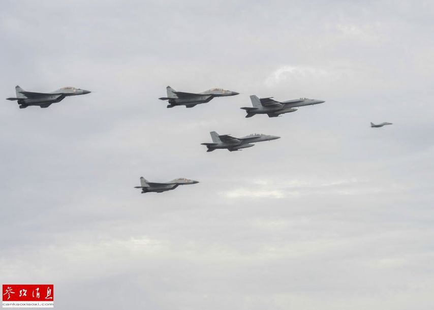 图为参演的美印海军航空兵机群。这一机群混编了美军的F/A-18“超级大黄蜂”战斗机和印军的米格-29K战斗机。