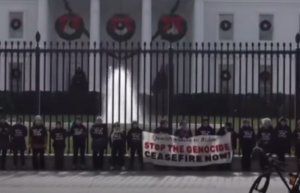 美国总统拜登和夫人当地时间11日在白宫举行一个犹太节日聚会前几小时,有十几名犹太裔长者用铁链将自己锁在白宫外围栏,促请拜登不要再反对以色列和哈马斯马上在加沙永久停火。示威者表示,难以忍受二次大战、波兰奥斯威辛集中营大屠杀后,再发生种族减绝,巴勒斯坦人正被炮弹和饥荒杀害。他们大声读出,自10月以来被以色列部队杀害的巴勒斯坦人名字。