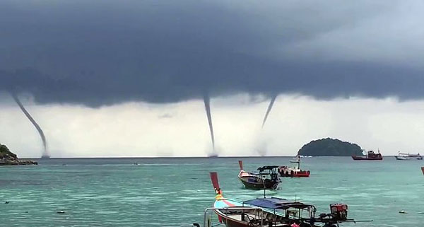 当地气象预报局发言人素拉蓬•萨拉帕(Surapong Sarapa)解释说:“在安达曼海岸的雨季,水龙卷是非常常见的,但是同时出现四个实属奇观。”