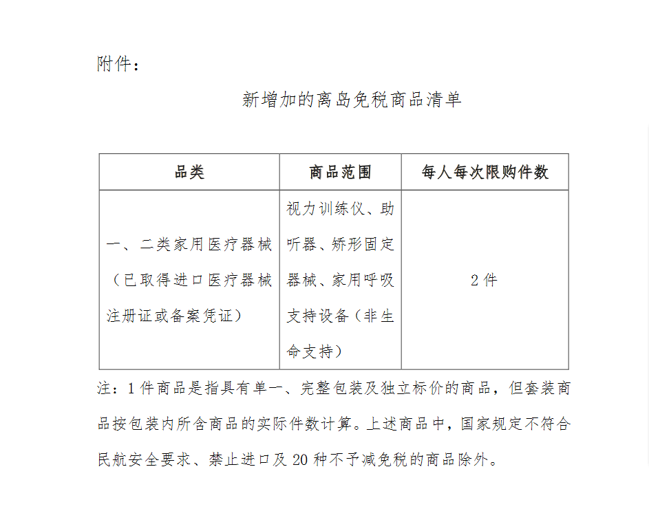二、增加部分家用医疗器械商品,在离岛免税商品清单中增加视力训练仪、助听器、矫形固定器械、家用呼吸支持设备(非生命支持),每人每次限购2件(详见附件)。